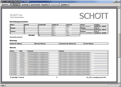 Zu jeder Schicht - freie Vorgabe des Produktionszeitraums ist möglich - wird wahlweise manuell oder automatisch ein Herstellungsnachweis ausgedruckt. Der Herstellungsnachweis beinhaltet sämtliche zusammenfassende Angaben über die gefertigten Chargen. Die Auflistung erfolgt getrennt nach Wanne wobei zusätzliche Angaben zum zugehörigen Mischer, der mittleren Produktionszeit, der Glasart sowie der zu dieser Wanne gefertigten Chargennummern im Nachweis enthalten sind. Zusätzlich werden die während der Produktion aufgetretenen Störungen oder durchgeführten Wartungen an der Anlage aufgeführt.