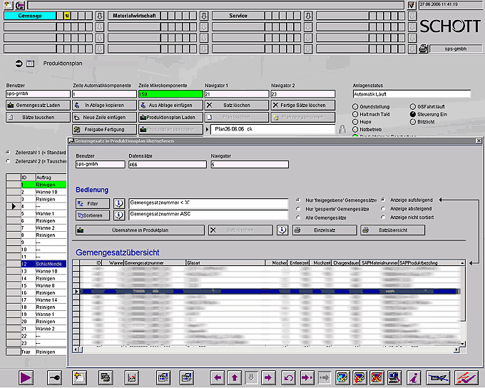 Die im Labor berechneten Gemengesätze werden in Form von Rezepten für die Erstellung des Produktionsplans bereitgestellt. Der Bediener wählt aus einer Liste von freigegebenen Rezepten den zu produzierenden Satz aus und trägt diesen an der gewünschten zeitlichen Abfolge im Plan ein. In diesem Plan kann die Produktion für einen Zeitraum von bis zu 1 Woche im voraus festgelegt werden. Der Produktionsplan beinhaltet zu jedem Gemengesatz zusätzliche Informationen wie Auftragskennzeichen, Ziel der Charge (Mischer, Reinigung etc.), Sollchargenzahl, Istchargenzahl, Status der Bearbeitung, Freigabe, Sollzeit der Bearbeitung, Istzeit der Bearbeitung etc.. Durch Verwendung des redundanten Serverpaares ist sichergestellt, das bei Ausfall eines Servers der zweite Rechner die letzte Version des jeweiligen Rezeptes bzw. des Produktionsplans zur Verfügung stellen kann. Im Labor wird entschieden welche Gemengesätze zur Produktion freigegeben sind bzw. welche Gemengesätze nicht freigegeben sind. Wird während der Produktion ein "gesperrter" Gemengesatz erkannt, so wird in den vorhandenen Rezepten automatisch nach der höchsten - für diese Glasart - vorhandenen Versionsnummer gesucht und diese zur Produktion herangezogen. Features zur Bearbeitung wie etwa die Verwendung einer Zwischenablage, das Laden bzw. Speichern von Produktionsplänen, das Tauschen, Löschen, Einfügen und freie Editieren von Gemengesätzen gehören dabei zu diesem „Batch Control System“ ebenso wie der Austausch von Produktionsplänen nach Excel. Sämtliche Menüfunktionen und deren Anwahl sind grundsätzlich einfach gehalten und annähernd über einen einzigen Mausklick zu erreichen.